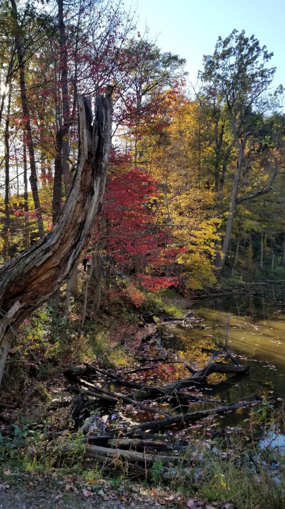 While feeling historically satiated, I still had an autumn colors scratch to itch. Thinking it might be best to head away from the center of the city, I drove to Rocky River Reservation near the airport. Slinking down Valley Parkway, I knew I’d made a good choice; the colors were more striking here away from dense urbanization. Though there are many popular hiking choices within the Cleveland Metroparks system, Rocky River Reservation’s steep, 100-ft shale cliffs are an unusual sight in Ohio. I headed to the nature center, which was closed due to COVID, but still a well-used trailhead. When I arrived, I had to park along the parkway far from the building. Everyone, it seemed, was taking advantage of that rare alignment in Ohio: perfect weather on a weekend during peak fall color season.