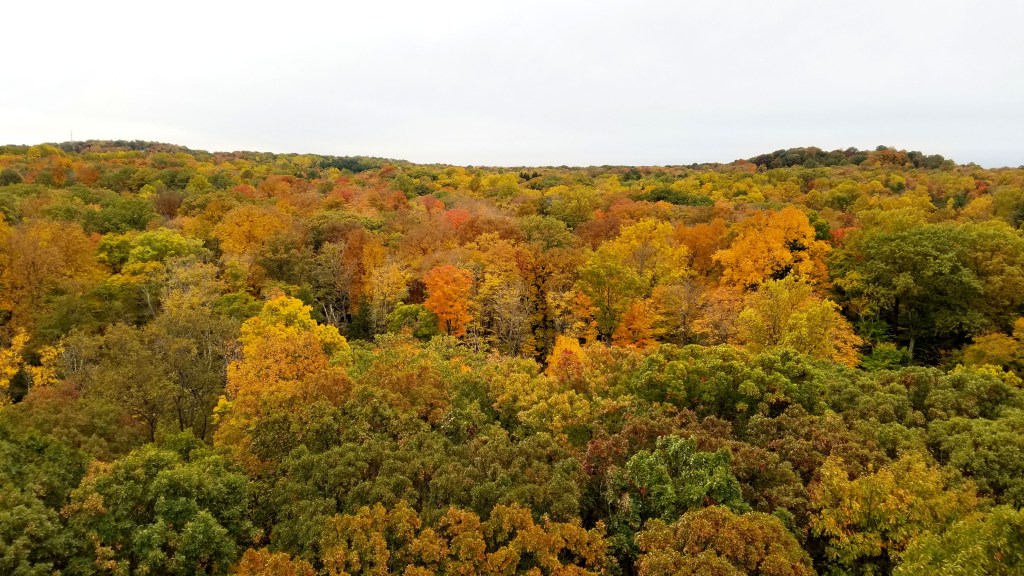 The next day, I headed even further out of town to the Holden Arboretum, a massive botanical garden and forest preserve 30 minutes east of town. Beyond the gardens are miles of wooded trails–the gardens portion is so big I didn’t have time to venture out. There are two unique opportunities in this park to get you closer to the trees. First, the Emergent Tower allows visitors to climb over 200 steps to view the forest canopy from above, with trees visible in all directions for miles.
