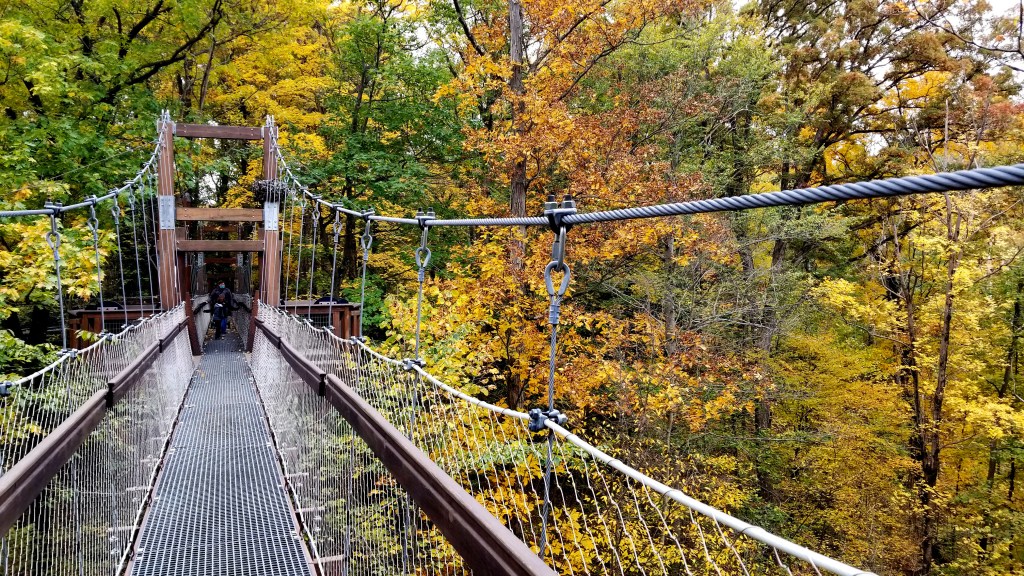 The second option, one that doesn’t get your heart rate up to get to the top, is the Canopy Walk. A walk up a long ramp gets you to a series of suspended bridges through the canopy, immersing walkers in a world of leaves and branches. The experience is doubly magical in the autumn with the leaves. For COVID reasons, they kept visitors on the Canopy Walk far apart, which also maintained the tranquility of the forest removed from crowds and noise.