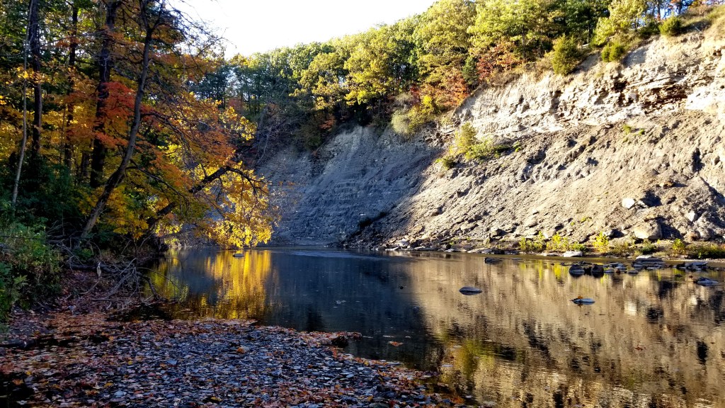 You can, and I did, go up the many flights of stairs to the top of the Fort Hill cliff for a good look at the cliff face. It’s a bit more of a gradual climb coming up the other way, if you really must go up. For my money, the better view is from down below, on the opposite side of the Rocky River. Walk across the Valley Parkway bridge and along the river until you find an easy way to descend to the river bank. The water level seemed relatively low at the time–I wouldn’t be surprised if during spring or summer downpours you wouldn’t be able to do this–but on this clear autumn day the water was low and the bank wide and pebbly. From here, you can appreciate the scale of the cliff.